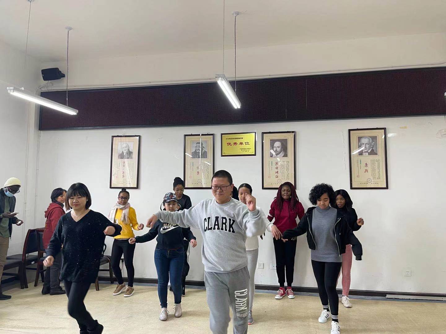 教师陈正府博士现场教留学生跳苗族反排鼓舞串烧恰恰伦巴,反响热烈,整个新春慰问会气氛欢快。最后博业体育