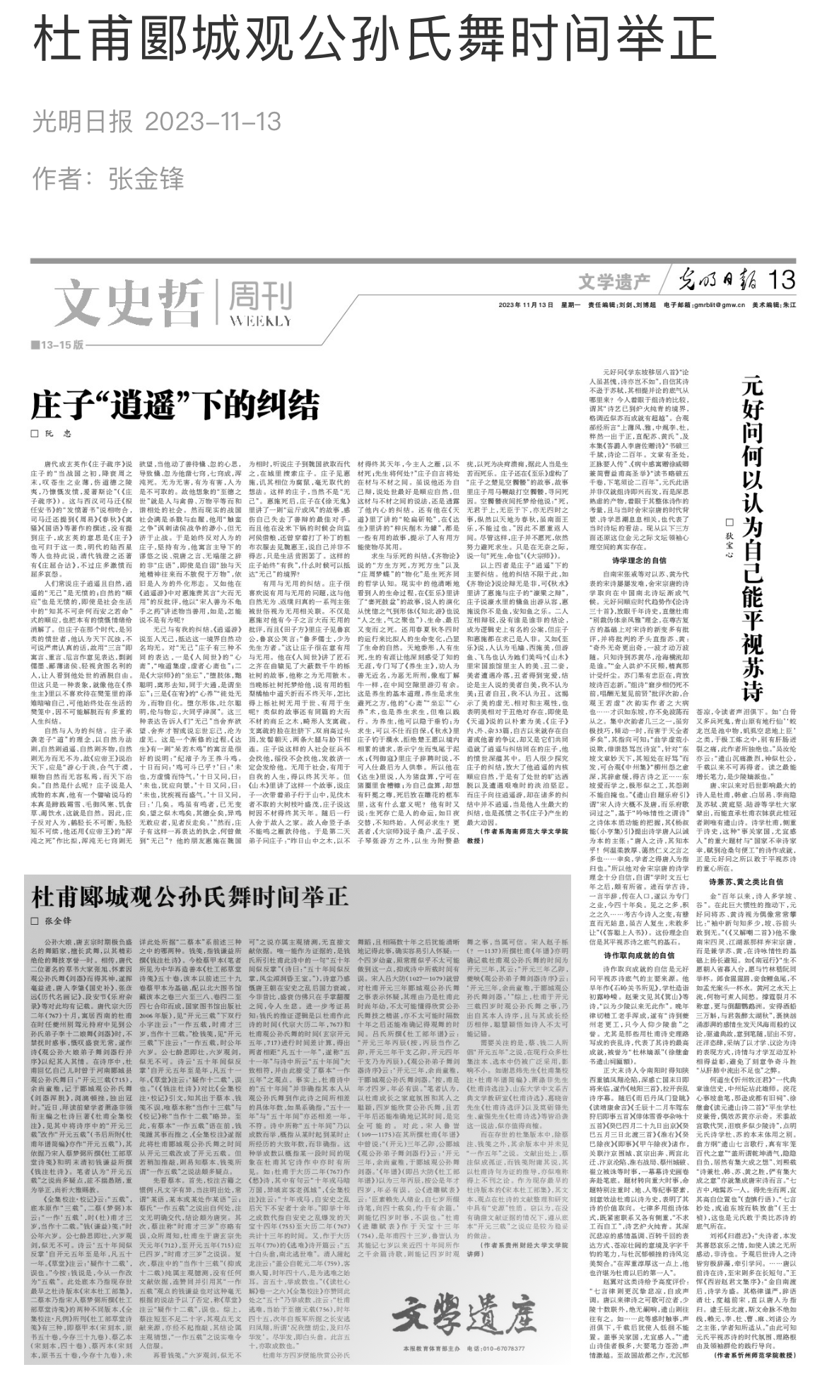 教师张金锋撰写的学术论文《杜甫郾城观公孙氏舞时间举正》(全文3149字)在《光明日报》第13版《文史哲周刊·文学遗产》发表。